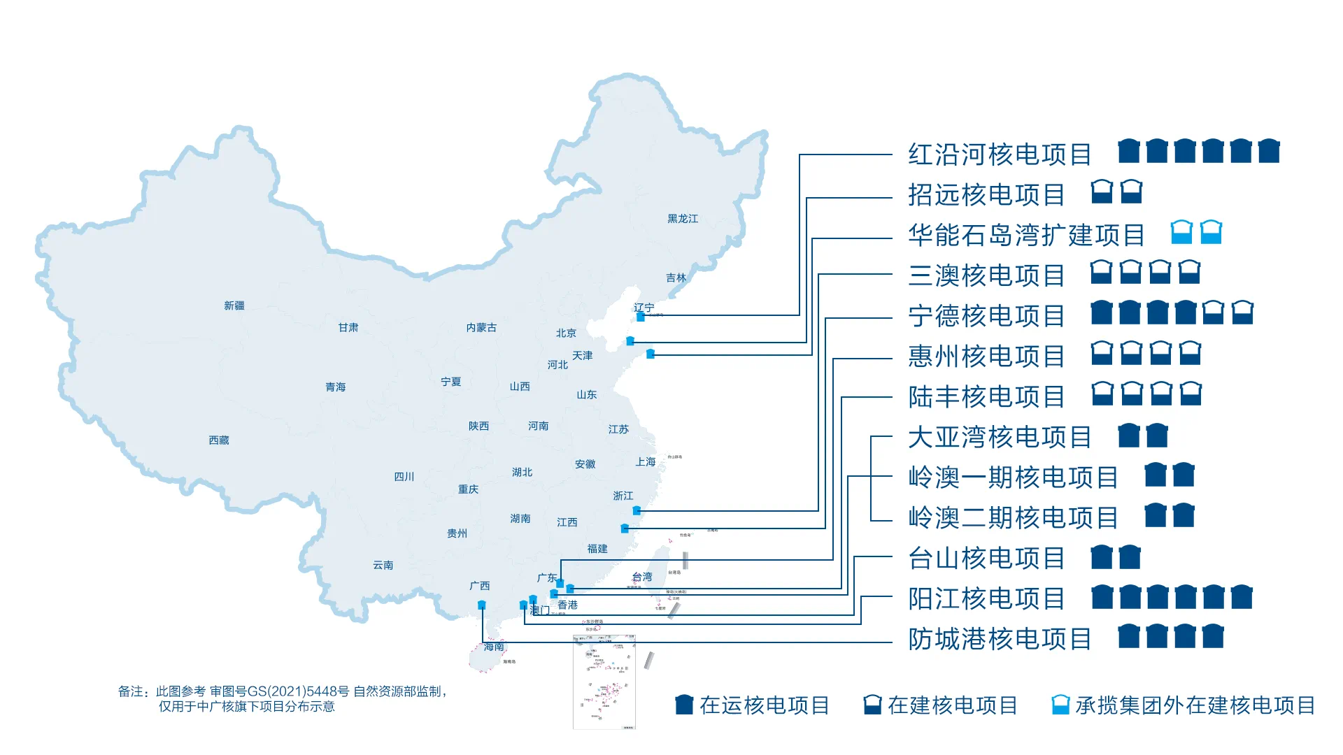 中國廣核集團目前在運核電機組共28臺,裝機容量3179.8萬千瓦,核準在建核電機組16臺,裝機容量1940.6萬千瓦。其中14臺機組采用中廣核自主研發(fā)并通過英國GDA認證的三代核電技術(shù)“華龍一號”,分別為廣東太平嶺1-4號機組、廣東陸豐5/6號機組、浙江三澳1-4號機組、福建寧德5/6號機組和山東招遠1/2號機組。此外,中廣核工程有限公司還負責華能山東石島灣擴建工程一期2臺機組的設計總包和設備成套,同時推進機組數(shù)量達18臺。