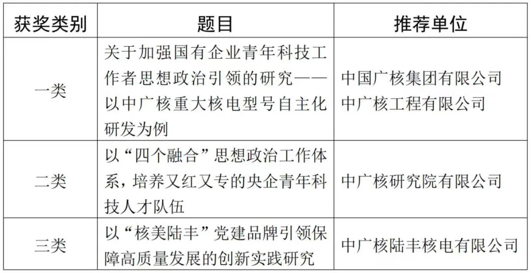 本次中國電力思想政治工作研究會共評選出優(yōu)秀研究成果100篇,包括30篇一類優(yōu)秀研究成果,40篇二類優(yōu)秀研究成果和30篇三類優(yōu)秀研究成果。其中中廣核獲評一類優(yōu)秀研究成果1篇、二類優(yōu)秀研究成果1篇、三類優(yōu)秀研究成果1篇。